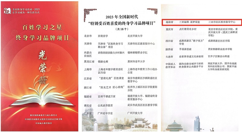 三亚市社区教育指导中心(JN体育)联合三亚市教育局、江南体育官方网站团委共同申报2023年全国新时代“终身学习品牌项目”。经省教育厅推介、教育部职成教司评审,公司海洋科普教育品牌《三亚起航 逐梦深蓝》荣获2023年全国新时代“特别受百姓喜爱的终身学习品牌项目”,是全国16个获此殊荣的品牌之一。此案例还列入《新时代社区教育案例•百选》。